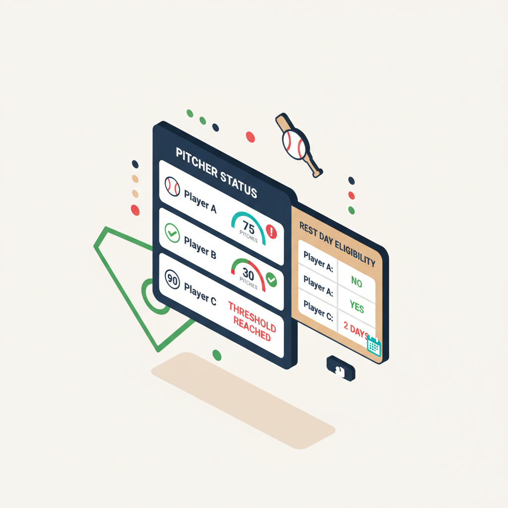 | Mandatory rest days | Calculates required rest days after each game based on pitches thrown. Blocks pitchers from being assigned before they're eligible. |
