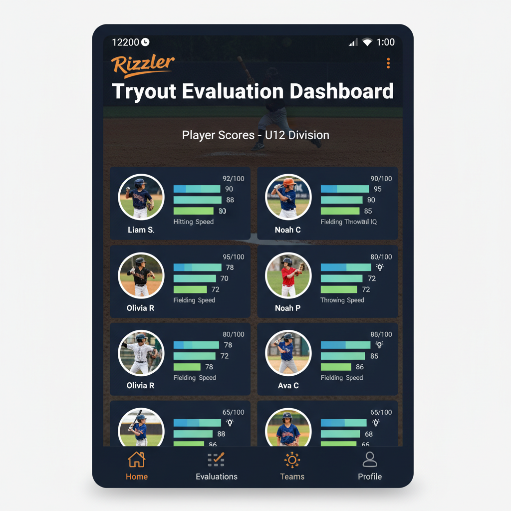 Rizzler helps travel and select baseball clubs run organized, fair tryouts — with custom scoring rubrics, multiple coaches evaluating simultaneously on their phones, side-by-side player comparisons, bias-reduction tools, and clean data for roster decisions. Tryouts are the first impression your club makes on prospective families. Make it a good one.